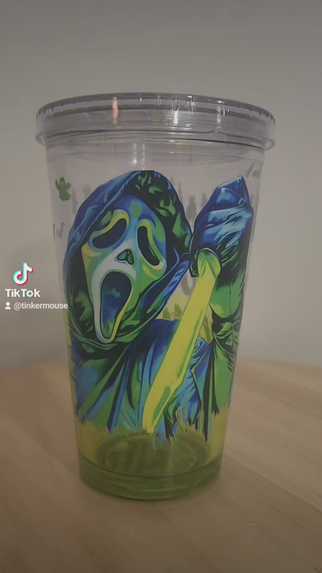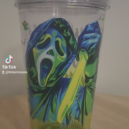 Wrapped with a Ghostface themed wrap and filled with a green like drip this cup is mesmerising and perfect to watch horror films with. It is a tapered 16oz acrylic tumbler.